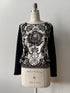 Oriane attire d’abord le regard par son motif riche et expressif, comme un dessin délicatement posé sur le vêtement, dont la présence graphique est équilibrée par la sobriété d’un dos et de manches entièrement noirs qui apportent profondeur et élégance à l’ensemble. Un ourlet élastiqué permet de blouser le vêtement plus ou moins selon l’envie, créant une silhouette légère et souple qui accompagne le mouvement sans jamais contraindre. La coupe demeure fluide et confortable, pensée pour le quotidien autant que pour les moments où l’on souhaite simplement se sentir belle, sans effort. Confectionnée avec soin dans notre atelier de Montréal, Oriane incarne cette élégance discrète et durable propre à Kollontaï : un vêtement qui traverse le temps avec douceur.